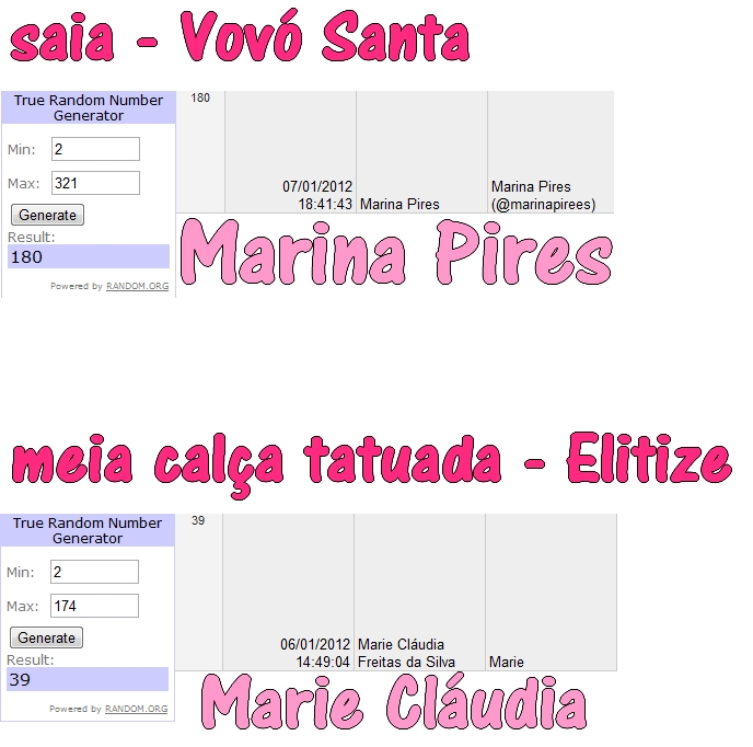 Como combinado, hoje, dia 20, eu anunciaria os resultados dos sorteios da saia – Vovó Santa e da meia calça tatuada – Elitize.