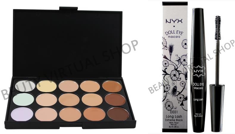 Essa paleta com 14 cores de corretivos e 1 iluminador, e um rímel Doll Eye Mascara – Long Lash, da NYX.