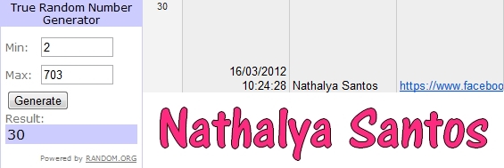 Parabéns, Nathalya! Você ganhou e seguiu todas as regras direitinho. Já te mandei um e-mail; você tem no máximo 48 horas para me responder com seu nome completo e endereço com CEP para receber seu prêmio, tá bom?