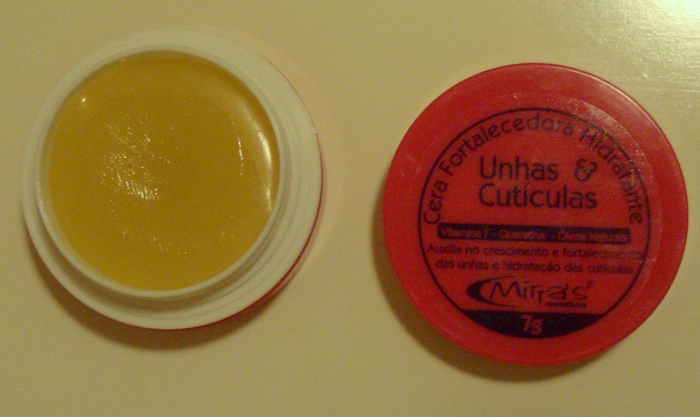 O que o fabricante promete: Auxilia no crescimento e fortalecimento das unhas e hidratação das cutículas. Enriquecida com Vitamina F – Queratina e Óleos Naturais. Espalhe suavemente a cera em toda a região das unhas e cutículas em movimentos circulares, e aguarde a cera ser completamente absorvida. Uso diário. Custa, em média (o preço varia de loja para loja), R$6,00.
